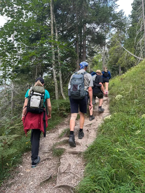 Unser Wanderführer Reinhard – dessen geführte Touren übrigens auch für Gäste buchbar sind – sorgte nicht nur für die nötigen Verschnaufpausen, sondern auch für spannende Einblicke in die Welt der Pflanzen und die erstaunlichen Fähigkeiten der alpinen Flora und Fauna. Nach rund 2 bis 3 Stunden Gehzeit erreicht man die Hütte, der letzte Abschnitt wird noch einmal spürbar steiler. Doch schon unterwegs geben lichte Waldstücke und kleine Stufen einen Vorgeschmack auf das Panorama, das oben wartet.
